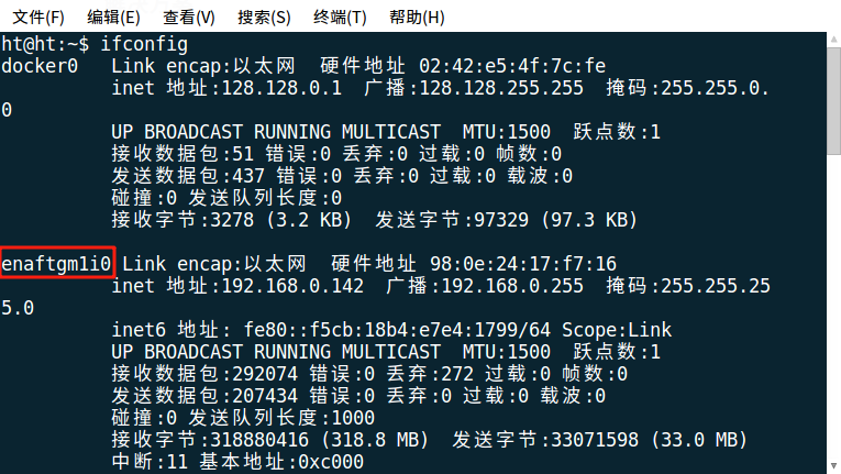 1.使用ifconfig命令查看默认的网卡名称