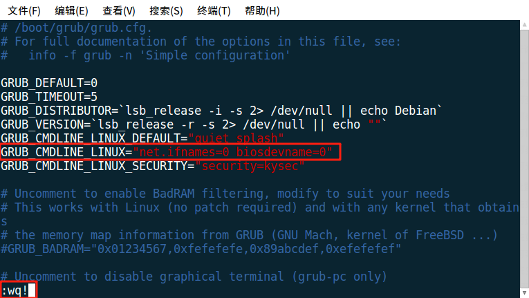 如图所示:eth0 为修改后的网卡名称。然后,按下Esc,再输入:wq保存退出。